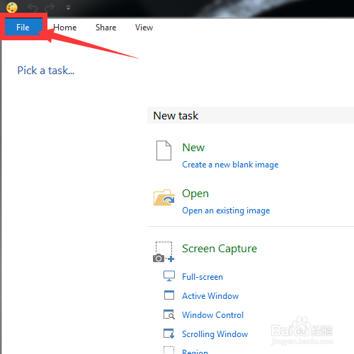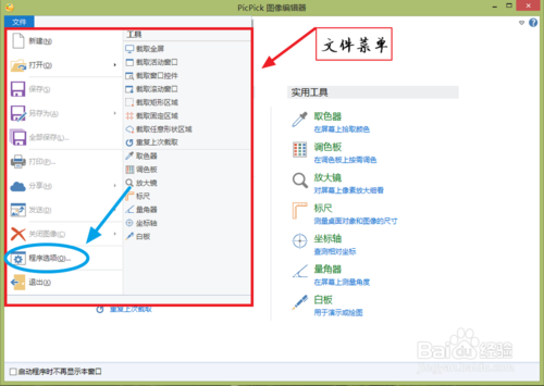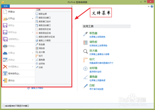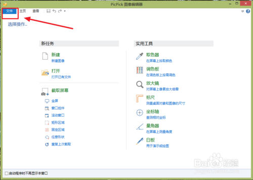 首先打开picpick。可以看到整个的界面都是用的英文。然后我们点击左上角的【File】
