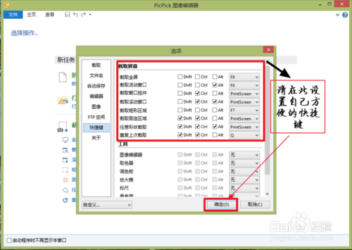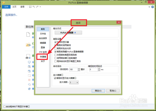 设置中:在“选项”窗口的左侧栏中,单击“快捷键”,右侧就会出现相应的设置选项,这时就可以设置截屏快捷键等了,设置完后单击“确定”。