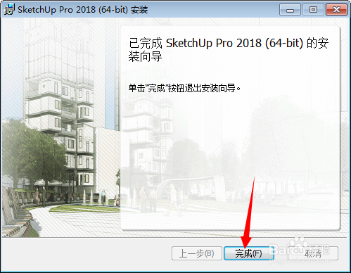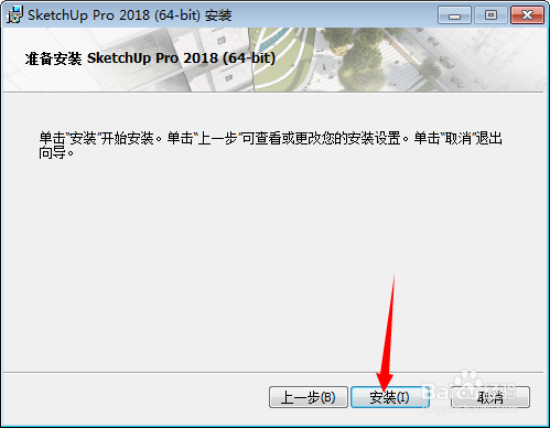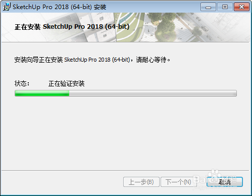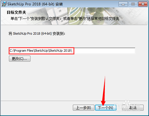 7、选择安装路径,默认安装在 C:\Program Files\SketchUp\SketchUp 2018(建议各位还是不要吝惜C盘的空间,毕竟更改默认安装目录会有些后续插件会找不到,以后会很麻烦,默认就好,当然如果你是高手随便改...),然后点击“下一个”