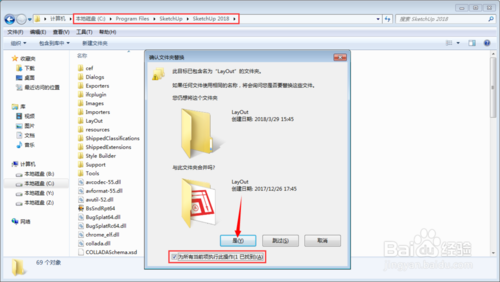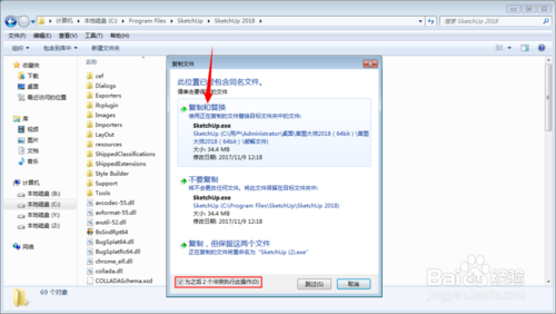 12、打开安装路径(默认为 C:\Program Files\SketchUp\SketchUp 2018),粘贴刚刚复制的文件;然后将“为所有当前项执行此操作”前面的复选框挑勾,再点击“是”