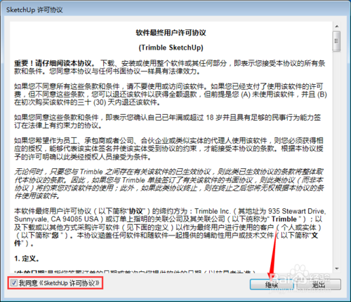 15、将“我同意《SketchUp许可协议》”前面的复选框挑勾,然后点击“继续”
