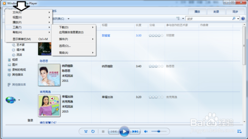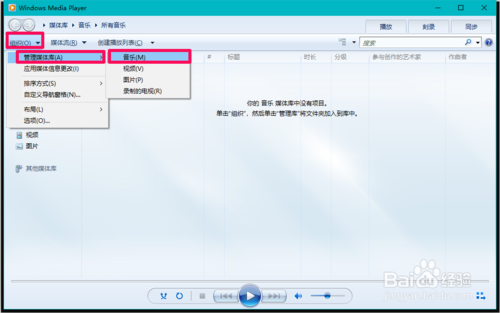windows media player 11 怎么添加音乐?1、从任务栏或开始屏幕中点击Windows Media Player图标,打开Windows Media Player播放器,点击【组织】,在下拉菜单中点击:管理媒体库 - 音乐;