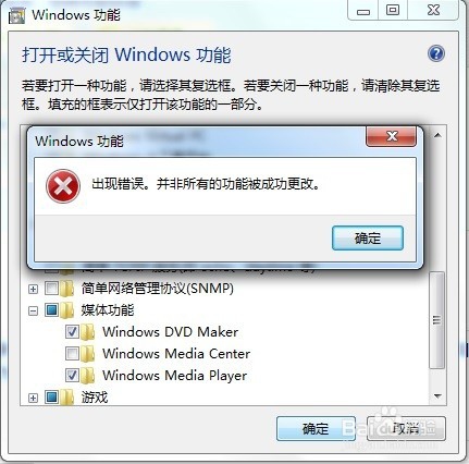 出错的提示是:Windows功能→出现错误。并非所有的功能被成功更改。→确定。