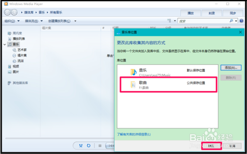 4、回到音乐库位置对话框,我们可以看到“歌曲”已添加到库位置中,点击:确定;