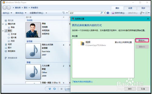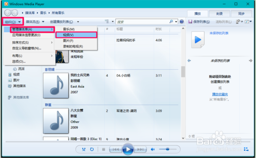 1、在Windows Media Player播放器中,点击【组织】,在下拉菜单中点击:管理媒体库 - 视频;