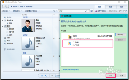4、回到视频库位置对话框,我们可以看到“广场舞”已添加到库位置中,点击:确定;