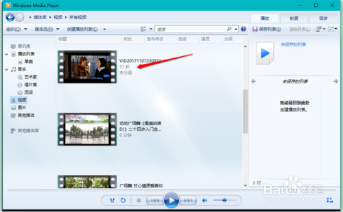 5、我们点击确定以后,便可以看到视频文件已添加到Windows Media Player播放器中,如果需要播放,左键双击视频文件就可以播放了。
