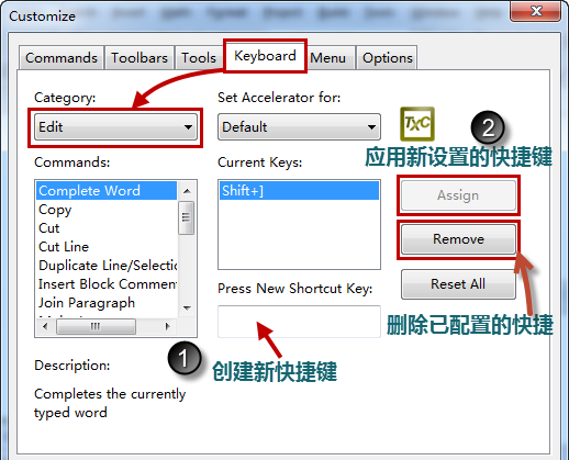 第二步,在定制对话框中,选择Keyboard标签,选择Edit分类中的CompleteWord选项。