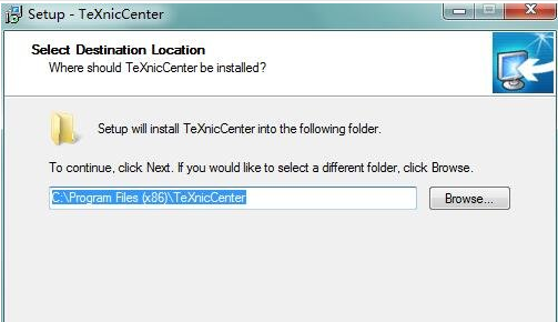 3、选择TeXnicCenter安装位置,默认的是“C:\Program Files (x86)\TeXnicCenter”,想修改点browse