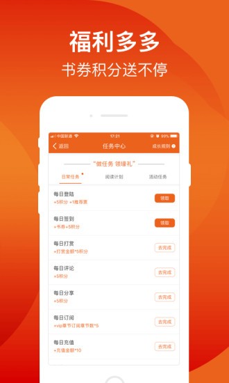 -任务中心福利多:做任务升等级赢书券,每日任务惊喜多多。
