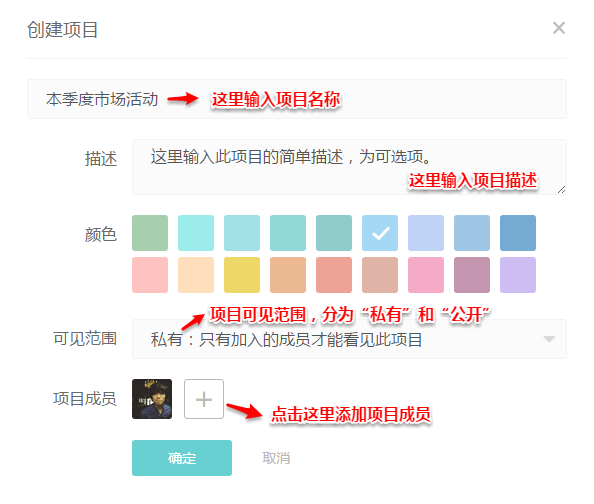 输入项目基本信息(名称、描述、颜色)并选择可见范围、项目成员