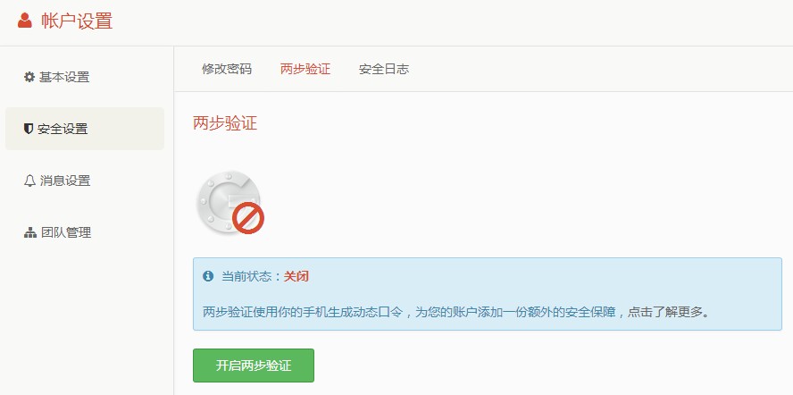 进入个人帐户设置,点击安全设置->两步验证,会看到两步验证默认是关闭的: