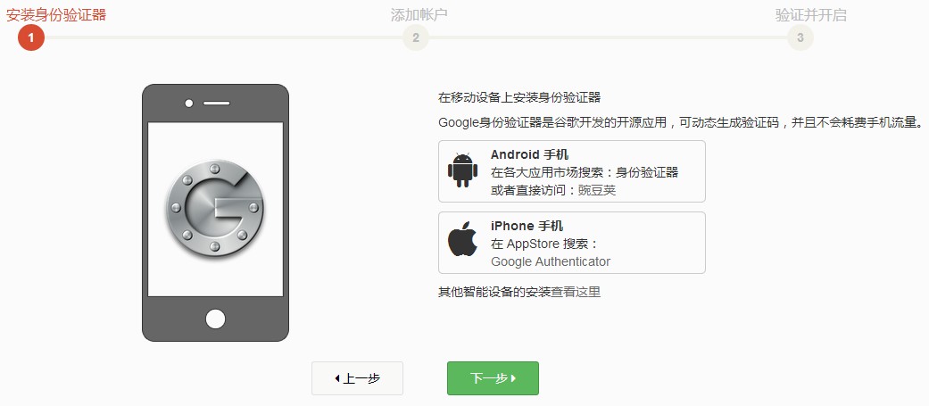 点击开启两步验证按钮,系统会确认是您本人操作后,进入第一步,在您的移动设备上安装Google身份验证器: