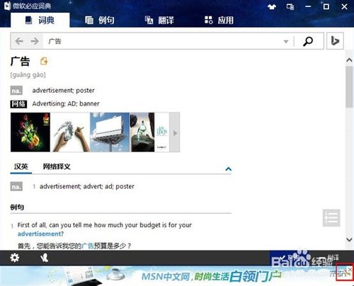 点击必应词典广告栏右上角上的“X”按钮关闭必应词典的广告栏。