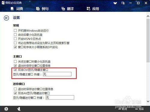 必应词典显示和隐藏主窗口的快捷键是双击Ctrl,也可以在必应词典的设置里面的常规设置中,设置自己习惯的显示和隐藏主窗口的快捷键