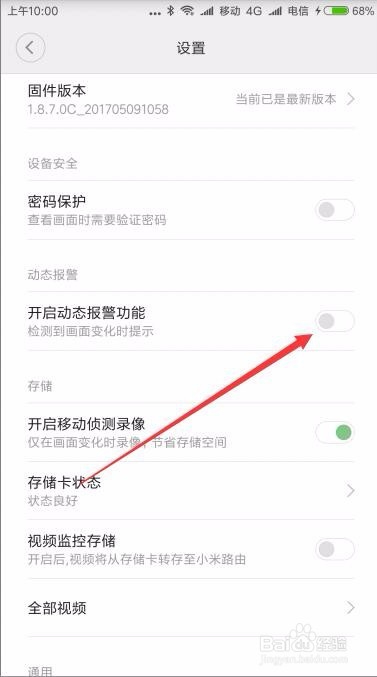 这时就会打开小蚁智能摄像机的设置页面了,点击“开启动态报警功能”后面的开关,使其打开。