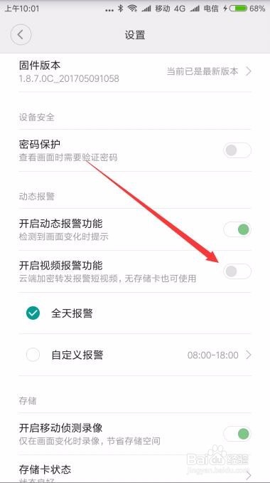 如果你的摄像头没有内存卡的话,可以点击下面的“开启视频报警功能”后面的开关,使其打开,这样即使没有内存卡也会自动报警哦。