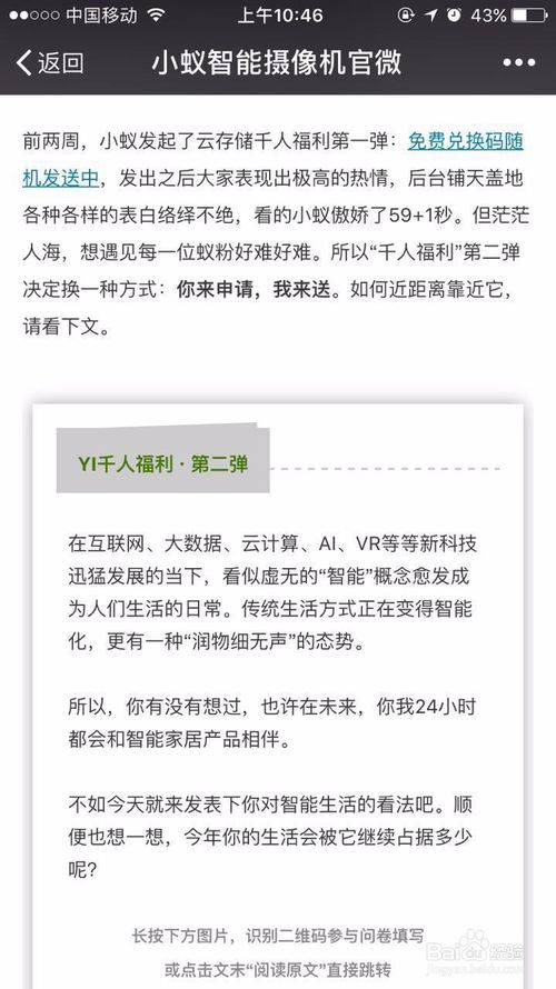 那么如何才能获得服务码呢?原来只要在小蚁智能摄像机公众号后台申请就可以免费获得服务码!千人福利名额有限先到先得哦!