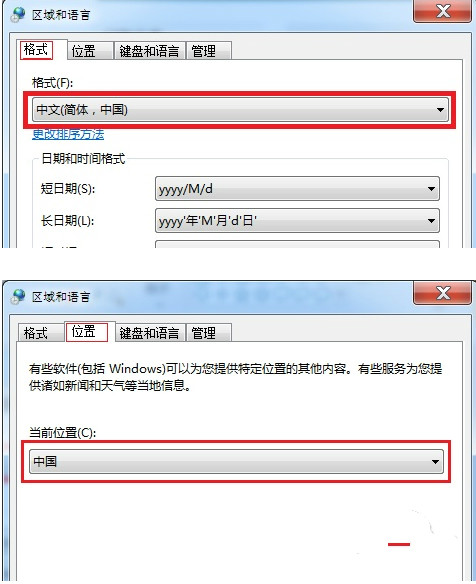 1、打开控制面板,点击区域图标,格式和位置都改成“中文、中国”。