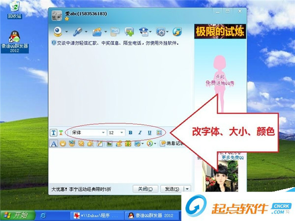 在QQ聊天窗口上面修改字体,发送时使用修改过的字体。如下图操作: