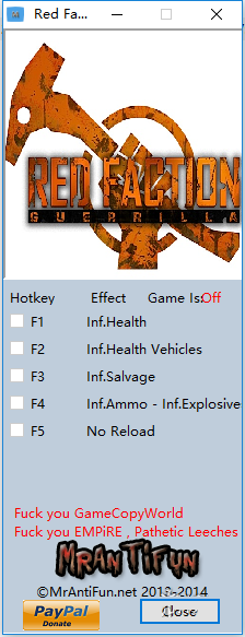 红色派系之游击战队修改器是一款专为《红色派系之游击战队》游戏玩家所提供的游戏修改工具。该工具可为玩家免费提供无限生命、无限载具生命、无限营救、无限弹药、不用换弹等等六项修改功能,有需要的玩家自行下载。