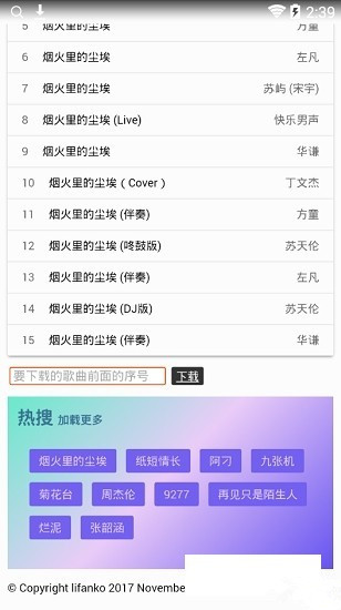 输入关键词选择平台进行搜索输入歌曲的序号进行下载