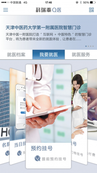 科瑞泰Q医,移动互联智慧门诊是将互联网与传统医疗服务相结合而构建的移动互联就医平台。患者可使用手机下载科瑞泰Q医APP,线上体验“按病痛选择科室、锁定医生快捷就医、化验结果实时推送、划价缴费在线支付、实时查看就诊顺序”的服务,完成预约、挂号、缴费等流程,实现轻轻松松就医,明明白白付费;也可以线下操作科瑞泰Q医自助机,使用身份证自费就医、医保卡医保就医、医卡通全面就医,银行卡现场支付,实现看病缴费不排队。