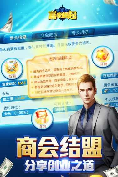 富豪崛起手机版是一款模拟经营类游戏,在这款游戏中你是一名商人,通过自己的才能打造你的公司,你的首要任务是建造你的公司还有培养你的员工,快去创造属于你的财富故事吧。