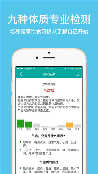 2、标准体质检测模块,5分钟测试自己的体质,权威认可。