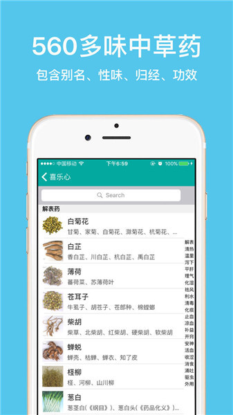 6、收录560多味中草药,包含图示、别名、英文学名、性味、归经及功效特征。