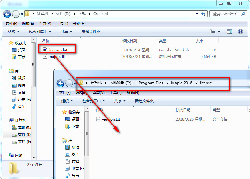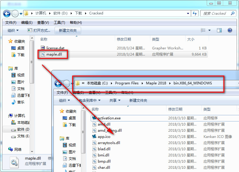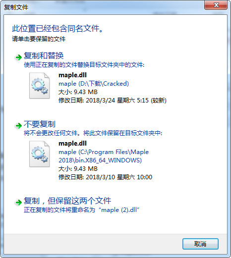 2.再将数据包中另一个破解文件“maple.dll”复制到软件的安装,目录中“C:\shandianxiazai\bin.X86_64_WINDOWS”在自动跳出的文件复制窗口,点击“复制和替换”即可
