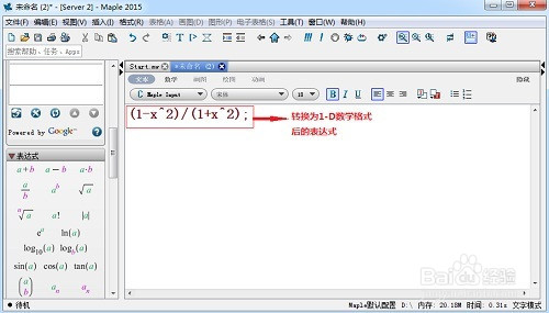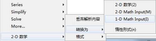 还可以将上面的2-D数学表达式转换为1D数学表达式,用鼠标右键点击上面的表达式,从右键菜单中选择“2-D数学——转换为——1-DMath Input”。