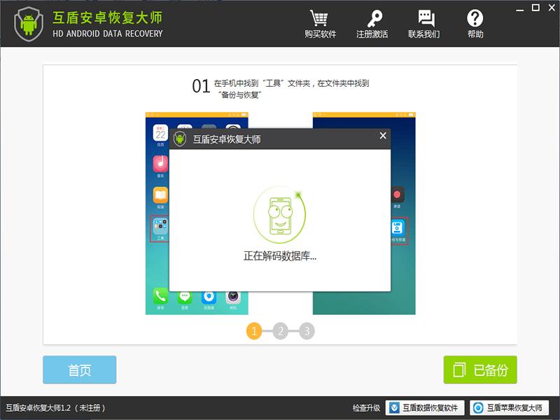 五、成功在手机上进行备份后,点击右下方的“已备份”按钮。软件会开始解析数据库数据。