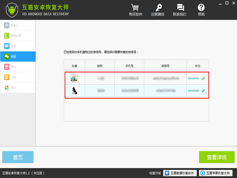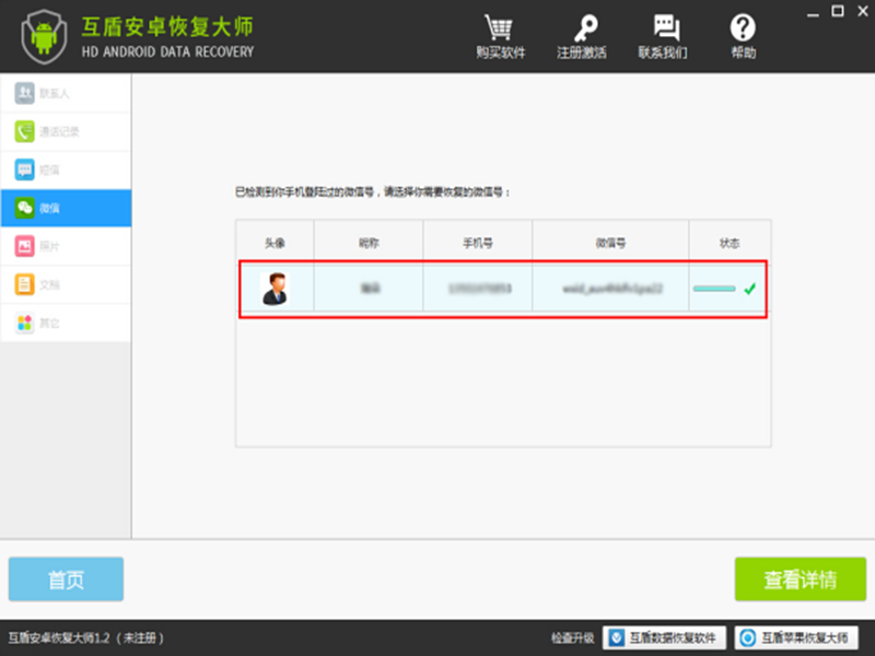 四、检测完成后,可以在软件的“微信”项目上,查看到在该手机上登录过的微信号,选择需要恢复数据的微信号,点击“查看详情”。