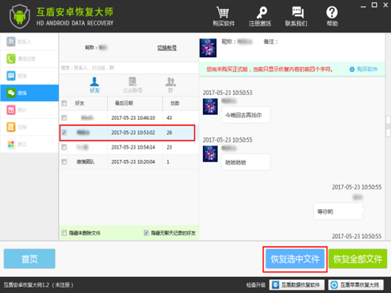 八、需要恢复某个微信好友的微信聊天记录时,勾选该好友,然后点击“恢复选中文件”,即可恢复该好友的微信聊天记录了。
