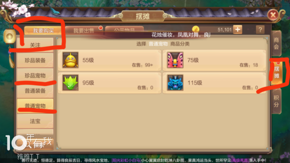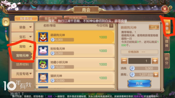 普通宠物购买方法:右上角交易-商会-我要购买-宠物-宠物元神(如下图所示)