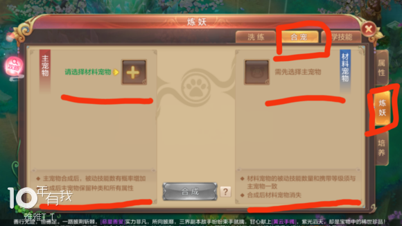 注意事项:a.同样携带等级的宠物才可以进行合成