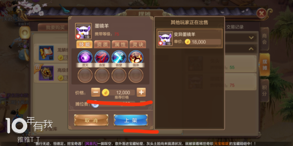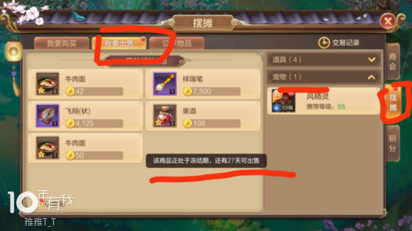 右上角交易-摆摊-我要出售-宠物-选择要出售的宠物-标定价格-上架(图一是锁定宠,图二是正常出售)