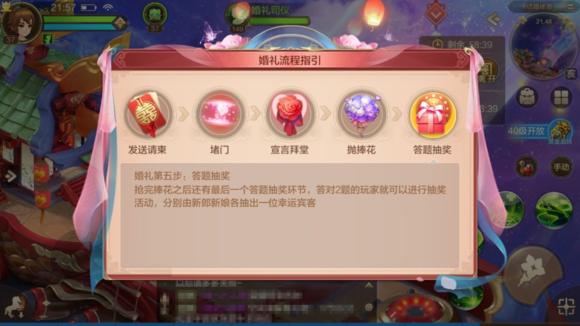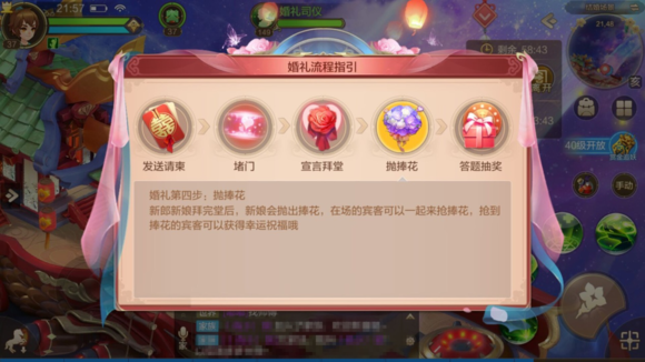 需要说明的是,花轿巡游阶段是可以跳过的,也就是说玩家订婚之后,可以选择不进行巡游,而直接开启婚礼,开启婚礼需要满足亲密度2000的要求,一般玩家达到36级左右的时候,系统赠送的花束加起来应该正好可以满足2000亲密度。