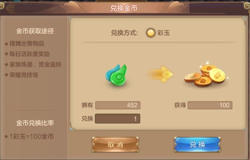 大家充值获得仙玉之后,就可以用来兑换金币。1仙玉可以兑换100金币,如果你急缺金币的话可以考虑充值仙玉哦。
