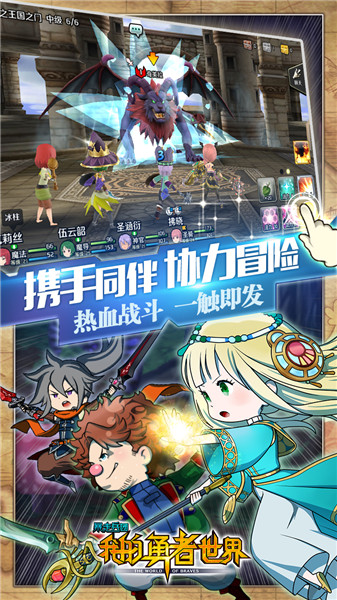 勇者们之间最多可以组成4人队伍,战斗模式为即时回合制,即每个角色的招式用完后都带有下一次的在使用的CD,但这不是公共CD,因此如果角色的招式和MP值比较多的话可以不停地轮流使用出招数进行火力压制。另外队友不是由玩家控制的,因此和在线勇者组队的话战斗效果会更好。当战斗到一定长时间后会产生[蓄力玉],这是可以对角色进行临时强化的能量,而且可以转让给队友,因此正确地使用[蓄力玉]的话能大幅度提升队伍战斗力。而且不管是在等待中或者战斗中,都能进行实时聊天,讨论战术。