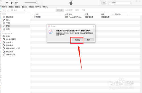4、我们用数据线将你的iphone连接到电脑,电脑会提示是否授权此电脑,点击继续按钮,如下图所示