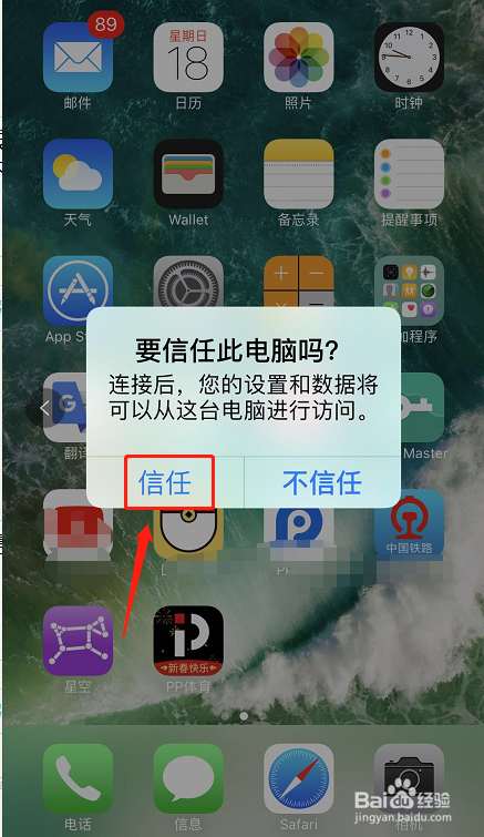5、来到手机,需要你确认是否信任此电脑,点击信任按钮,如下图所示