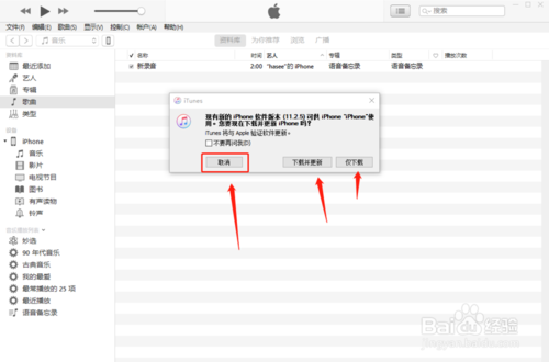 6、连接成功,itunes首先就检查你的手机是或否可更新,我们可以点击下载并更新来升级手机,也可以选择取消,如下图所示