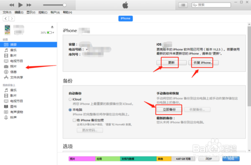 8、在手机操作界面,我们可以进行升级、激活、备份操作以及同步照片、音乐,如下图所示