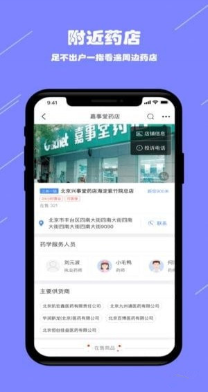 阳光药店app能自动识别和定位消费者的位置,以此为圆心,标注身边1公里范围内的药店。当消费者点开其中一个药店后,可以看到药店基本情况、经营药品品种、药学服务人员信息、具体地址、是否24小时售药、是否医保定点药店,也可以开启地图导航,方便快捷的找到药店。