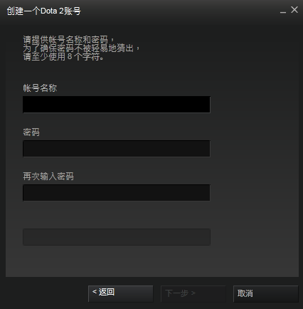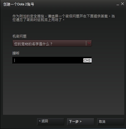 2) 按照流程,依次输入您要注册的DOTA2账号名称、密码、邮箱地址和密码保护问题,然后点击下一步开始创建账号。