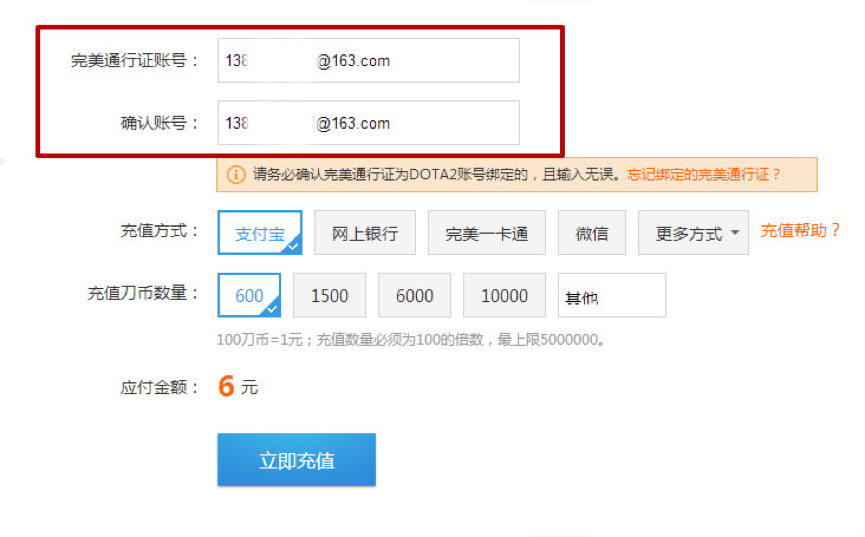 推荐您通过游戏内商城【刀币】按钮进入充值页面,这样您将直接跳转至您DOTA2账号绑定的完美通行证,从而保证您充值的账号无误。
