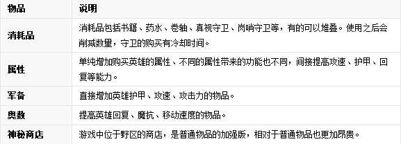 按照游戏中的设定,物品分为基础物品与升级物品,基础物品分为消耗品、属性、军备、奥数。升级物品分为普通、辅助、法器、武器、防具、圣物。游戏中的物品通常通过几个不同的商店购买合成。游戏中位于野区的神秘商店,出售的物品是普通物品的加强版,相对于普通物品也更加昂贵。