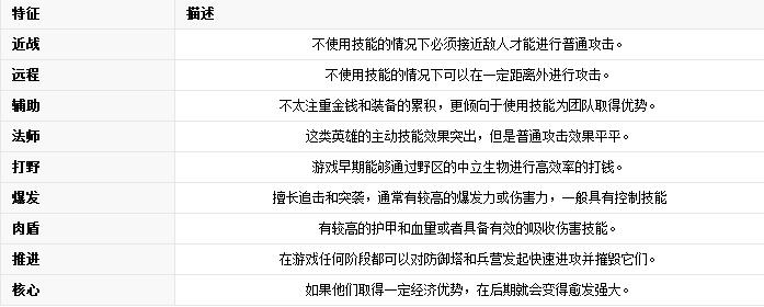 英雄的定位与属性不同,是后天决定的。因为同一种主属性的英雄也会有多种不同的团队作用,所以一个英雄的定位不是唯一的,而是多角度划分的,划分的标准是根据英雄自身的属性成长或技能的特点。例如一个近战英雄可能是DPS输出者,也可能是辅助,也可能是肉盾,也可能兼具其中数个要素。所有英雄的能力特点如下:
